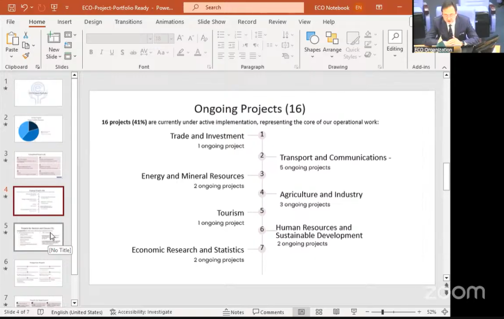 39 regional projects, covering the full spectrum of ECO’s areas of cooperation, were reviewed during the meeting. These projects – ranging from transport, trade and energy to environment, agriculture, and capacity building – were presented by the respective Directors of ECO departments, providing Member States with a detailed overview of implementation progress and proposed adjustments.